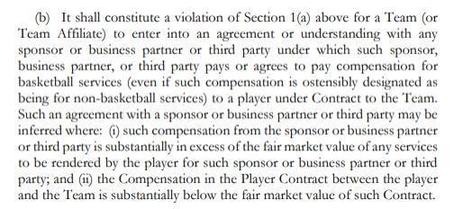 如果球队与任何赞助商、商业伙伴或第三方达成协议,而该赞助商、商业伙伴或第三方根据该协议向球队签约的球员支付或同意支付篮球服务报酬(即使该报酬表面上指定为非篮球服务),则构成对上述规定*的违反。