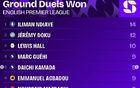 英超第5轮赢得地面对抗次数榜:恩迪亚耶14次居首,多库12次第二